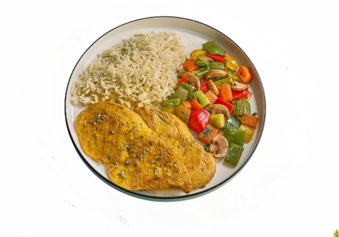 Grilled chicken with mustard and honey. Served with rice and sautéed vegetables.