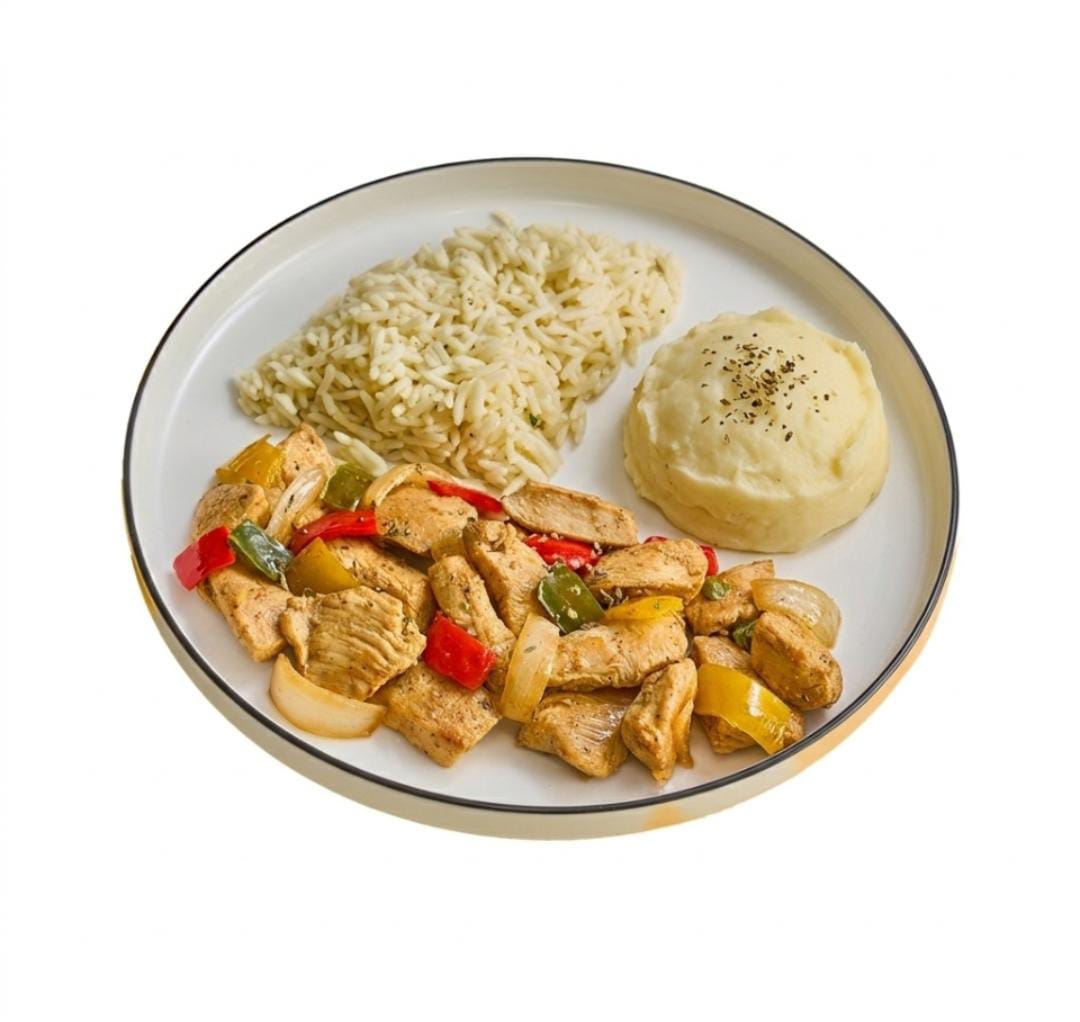 دجاج مشوي على الطريقة المكسيكية. يقدم مع الأرز والبطاطس المقطعة.